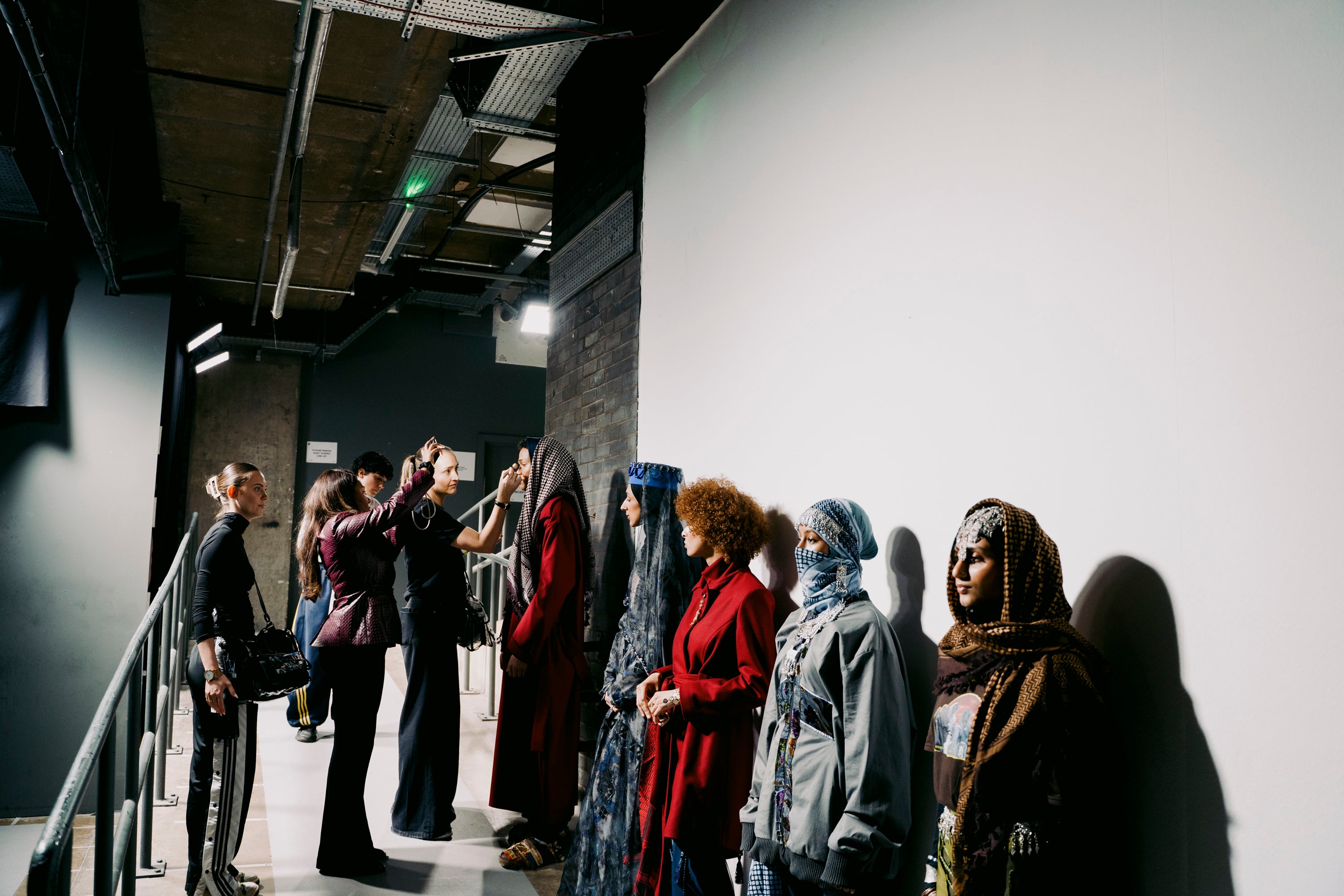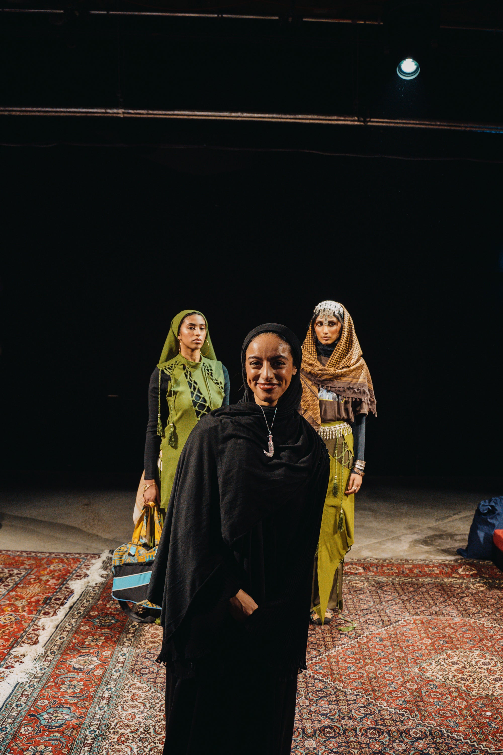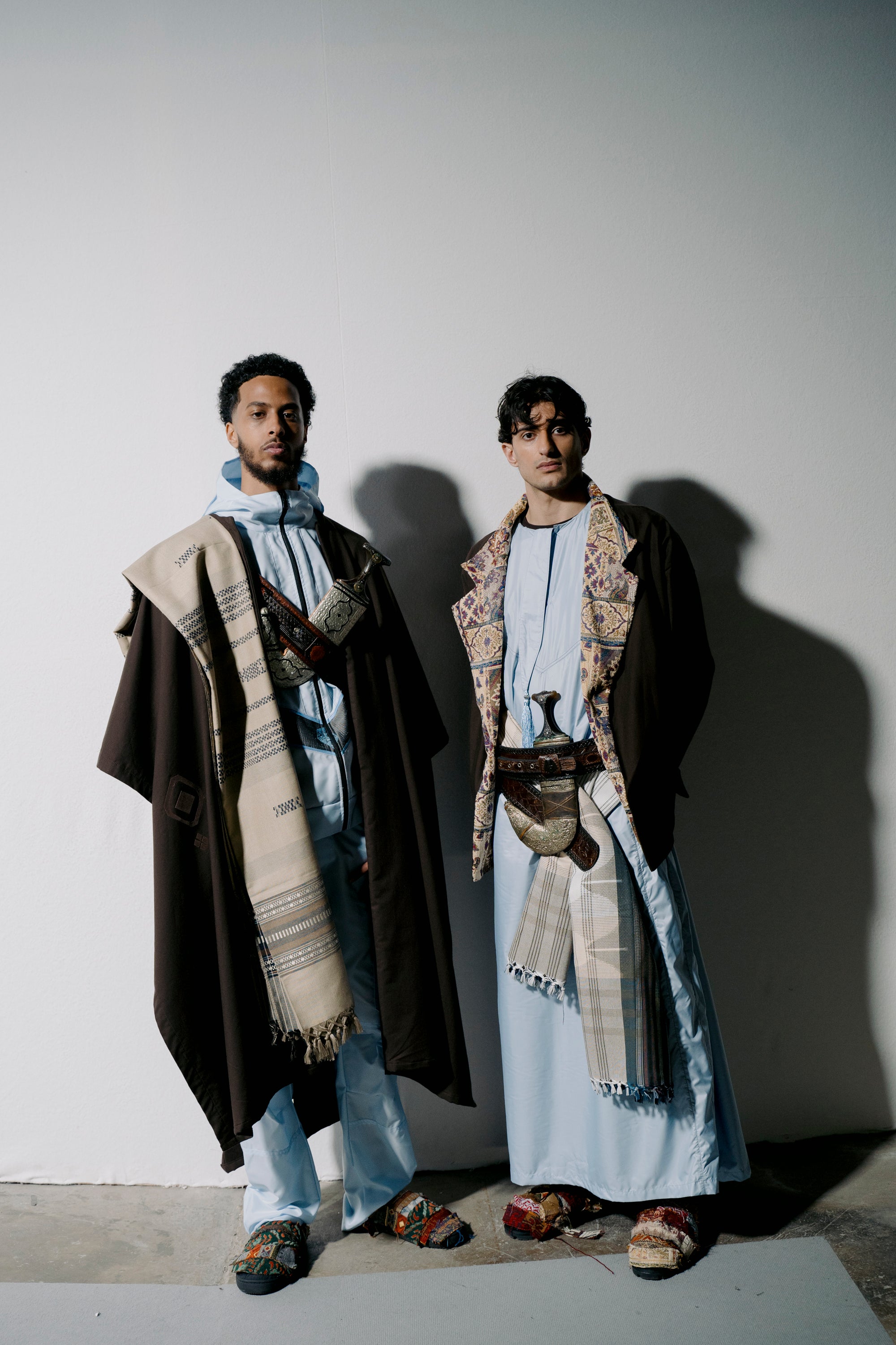 reinterpreted through sportswear and contemporary tailoring, while menswear bridges generations by pairing traditional thobes and cloaks with tracksuits and cargo trousers. Each piece becomes a bridge between landscapes, generations, and identities, linking Yafa’s mountains to Sheffield’s streets.