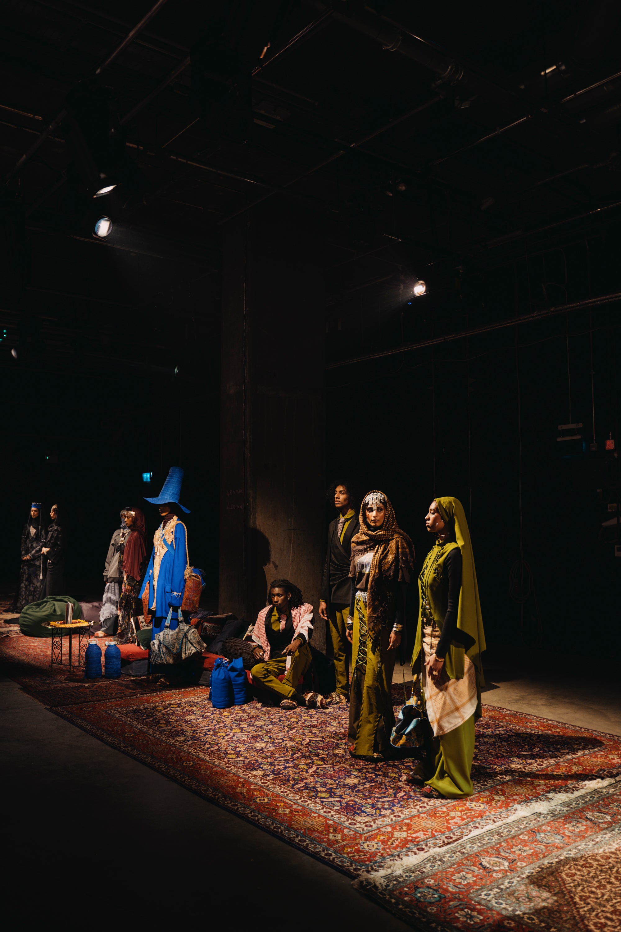 Kazna Asker’s Autumn-Winter 025 collection explores the dialogue between tradition and modernity, weaving Yemeni heritage with British streetwear. Its centrepiece is a cobalt-blue shepherdess figure, layered with Middle Eastern textiles and crowned by a reimagined straw hat created with milliner Lucy Barlow, echoing Yemen’s iconic Madhalla. Across the collection, garments from the MENA region—such as the abaya, muckwar, and butterfly abaya—are